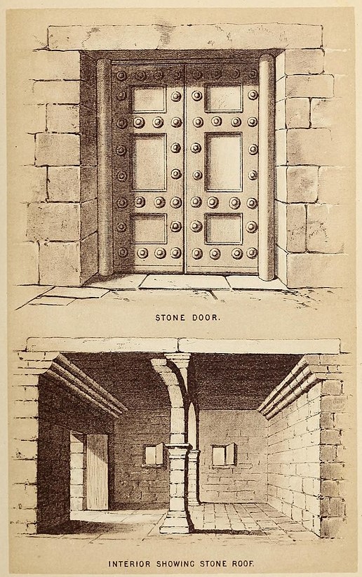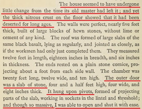 The dimensions, particularly of the door jumped out at me. 4 1/2 ft x 4 ft x 8 inches thick. That's not even as tall as our normal doors; was it a half-door? We would have to duck to get through that. The inside dimensions are not particularly impressive either; 20 ft x 12 ft x 10 ft. Not exactly the abode of a giant.