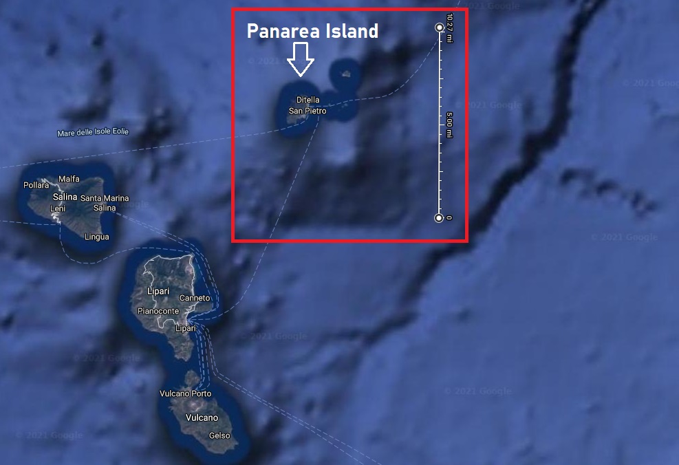 Went here Source and found out the islands name in modern Italian which is "Isola Panarea"