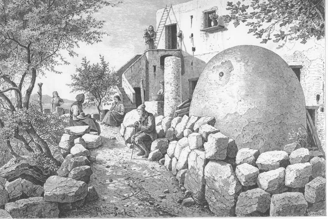 This suggests there were two types of rock at least in terms of colour in the area the chap was walking through.The dome shaped thing and column shaped thing behind the wall could I suggest be things used in the extraction and preservation of olive oil. I don't know much about old techniques in use in 1895 but given the double mention of olive trees in that passage it would be a fair bet that the olives were pressed nearby.