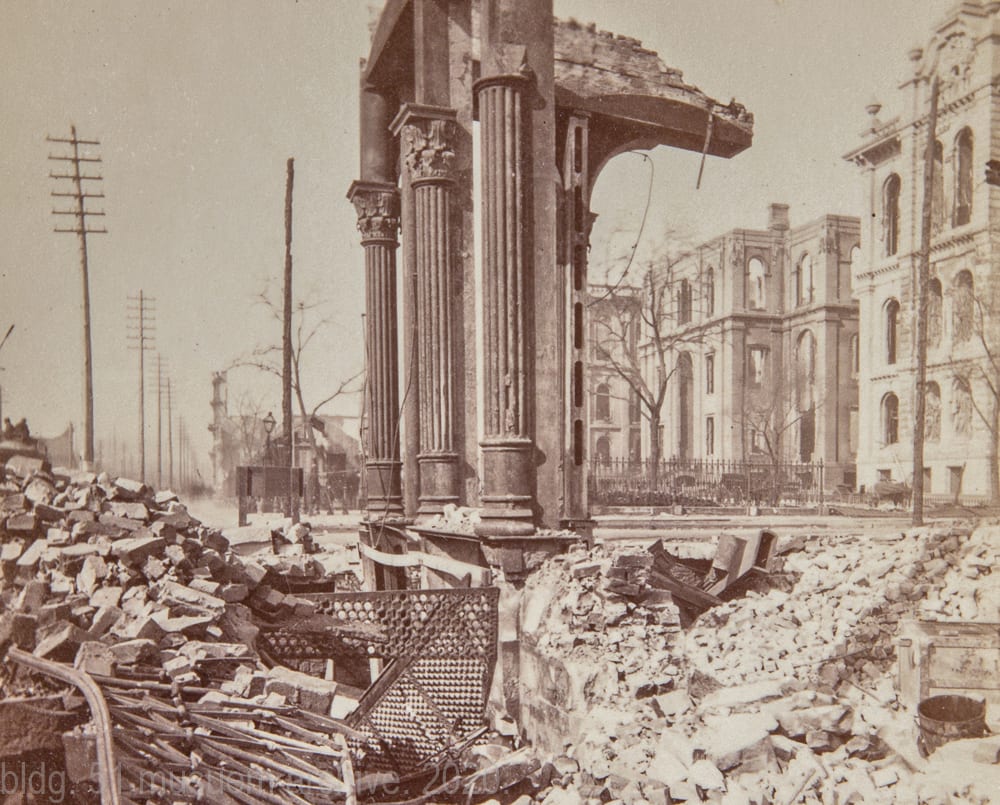 Ran into a couple of interesting photographs depicting buildings damaged by the Great Chicago Fire of 1871. That is per the PTB, of course.